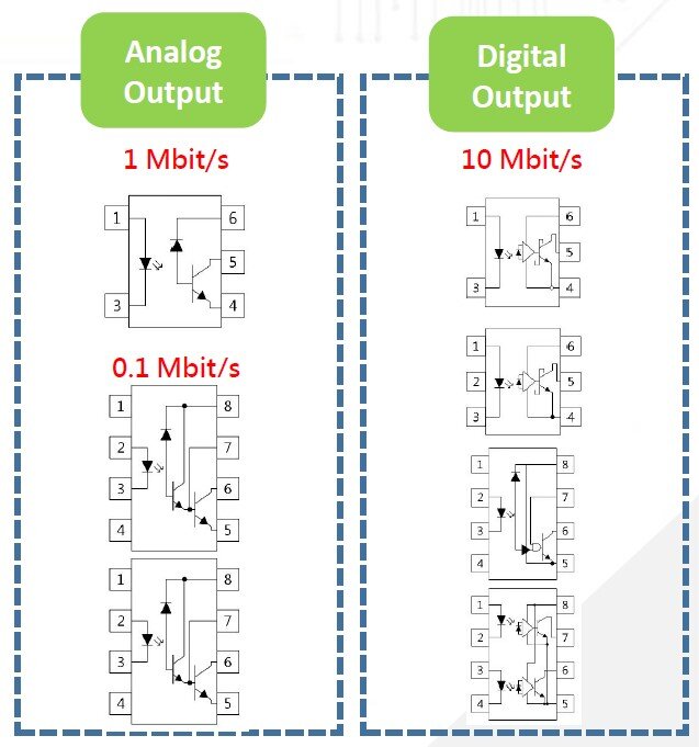 Hochgeschwindigkeits-Optokoppler bestehen aus einer Infrarot-Leuchtdiode (Sender), die optisch mit einem Hochgeschwindigkeits-Fotodetektortransistor (Empfänger) gekoppelt ist. Ein separater Anschluss für die Vorspannung der Fotodiode und den Kollektor des Ausgangstransistors erhöht die Geschwindigkeit gegenüber herkömmlichen Fototransistorkopplern um mehrere Größenordnungen, indem die Basis-Kollektor-Kapazität des Eingangstransistors verringert wird.